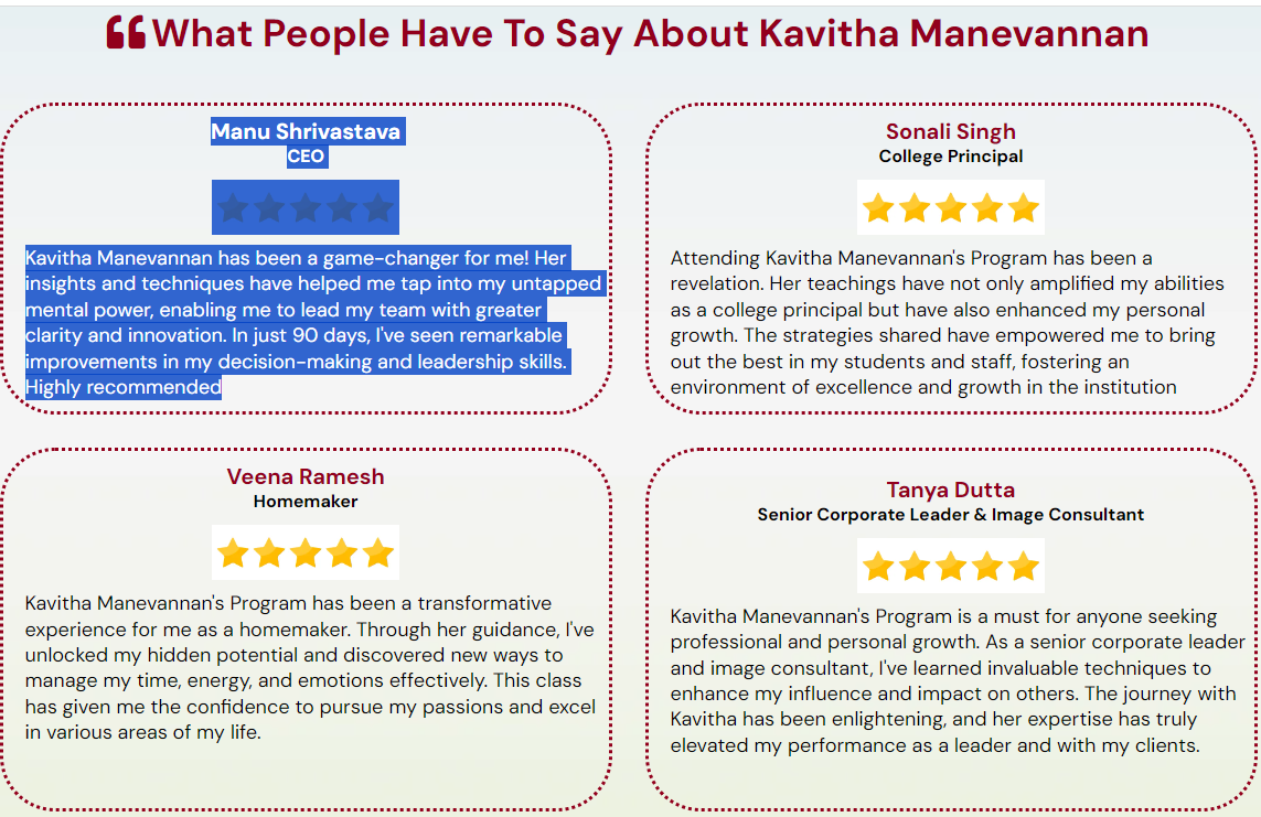 Kavitha Manevannan is a Life Transformation Expert and Confidence Coach who has dedicated her life to helping people break barriers, reclaim their power, and create lives of abundance. With 14 years of global leadership experience and 13+ years as a trainer and coach, she has touched the lives of more than 150,000 individuals worldwide—from working professionals and entrepreneurs to students and educators.